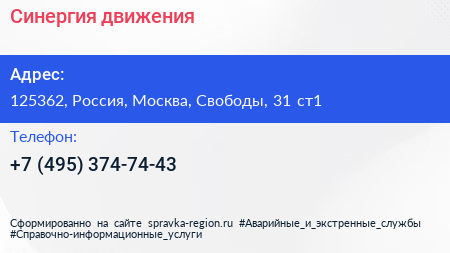Синергия движения по адресу 125362, Россия, Москва, Свободы, 31 ст1 в дальнейшем Организация, размещена в следующих категориях: