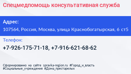 Спецмедпомощь, консультативная служба по адресу 107564, Россия, Москва, улица Краснобогатырская, 6 ст5 в дальнейшем Организация, размещена в следующих категориях: