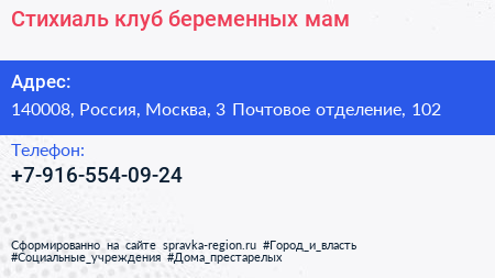 Стихиаль, клуб беременных мам по адресу 140008, Россия, Москва, 3 Почтовое отделение, 102 в дальнейшем Организация, размещена в следующих категориях: