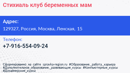 Стихиаль, клуб беременных мам по адресу 129327, Россия, Москва, Ленская, 15 в дальнейшем Организация, размещена в следующих категориях: