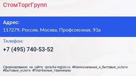 СтомТоргГрупп по адресу 117279, Россия, Москва, Профсоюзная, 93а в дальнейшем Организация, размещена в следующих категориях: