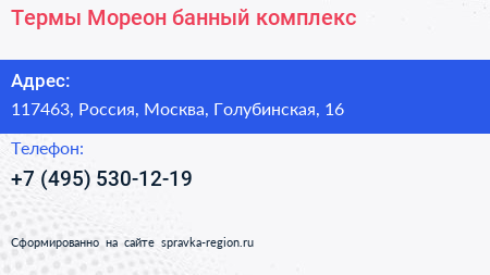 Термы Мореон, банный комплекс по адресу 117463, Россия, Москва, Голубинская, 16 в дальнейшем Организация, размещена в следующих категориях:
