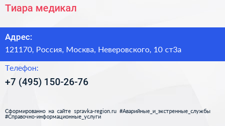 Тиара-медикал по адресу 121170, Россия, Москва, Неверовского, 10 ст3а в дальнейшем Организация, размещена в следующих категориях: