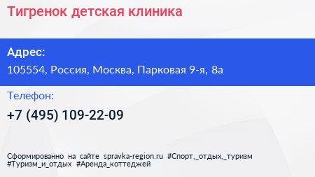 Тигренок, детская клиника по адресу 105554, Россия, Москва, Парковая 9-я, 8а в дальнейшем Организация, размещена в следующих категориях: