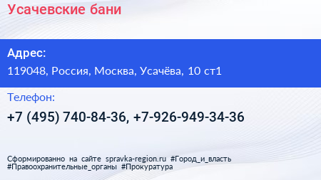 Усачевские бани по адресу 119048, Россия, Москва, Усачёва, 10 ст1 в дальнейшем Организация, размещена в следующих категориях: