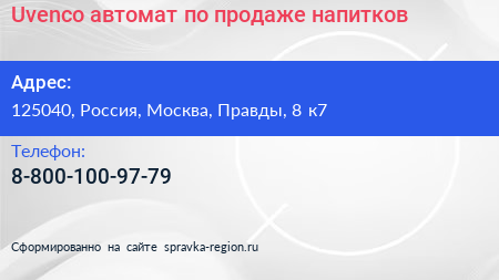 Uvenco, автомат по продаже напитков по адресу 125040, Россия, Москва, Правды, 8 к7 в дальнейшем Организация, размещена в следующих категориях:
