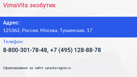 VimaVita, экобутик по адресу 125362, Россия, Москва, Тушинская, 17 в дальнейшем Организация, размещена в следующих категориях: