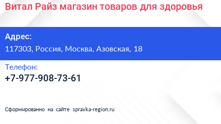 Витал Райз, магазин товаров для здоровья по адресу 117303, Россия, Москва, Азовская, 18 в дальнейшем Организация, размещена в следующих категориях: