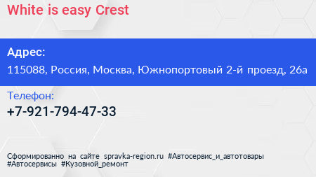 White is easy Crest по адресу 115088, Россия, Москва, Южнопортовый 2-й проезд, 26а в дальнейшем Организация, размещена в следующих категориях: