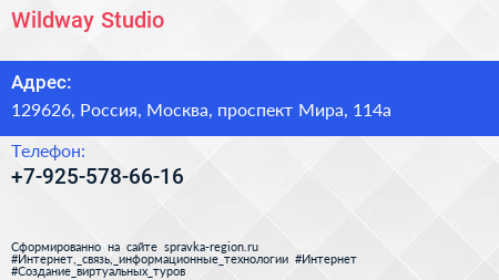 Wildway Studio по адресу 129626, Россия, Москва, проспект Мира, 114а в дальнейшем Организация, размещена в следующих категориях: