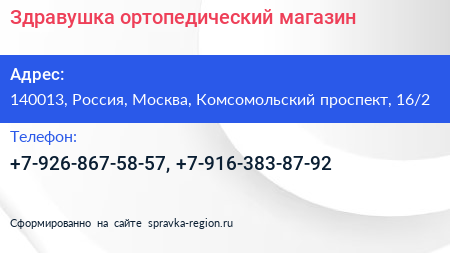 Здравушка, ортопедический магазин по адресу 140013, Россия, Москва, Комсомольский проспект, 16/2 в дальнейшем Организация, размещена в следующих категориях: