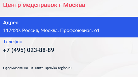 Центр медсправок, г. Москва по адресу 117420, Россия, Москва, Профсоюзная, 61 в дальнейшем Организация, размещена в следующих категориях: