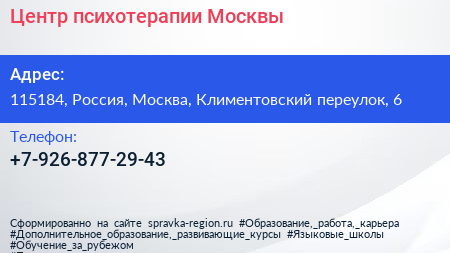 Центр психотерапии Москвы по адресу 115184, Россия, Москва, Климентовский переулок, 6 в дальнейшем Организация, размещена в следующих категориях: