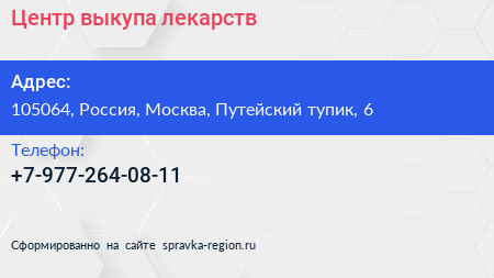 Центр выкупа лекарств по адресу 105064, Россия, Москва, Путейский тупик, 6 в дальнейшем Организация, размещена в следующих категориях: