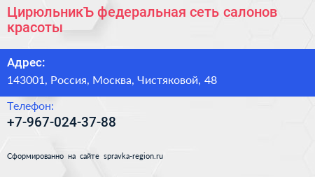 ЦирюльникЪ, федеральная сеть салонов красоты по адресу 143001, Россия, Москва, Чистяковой, 48 в дальнейшем Организация, размещена в следующих категориях: