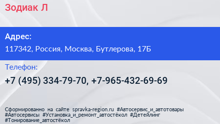 Зодиак Л по адресу 117342, Россия, Москва, Бутлерова, 17Б в дальнейшем Организация, размещена в следующих категориях: