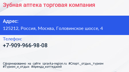 Зубная аптека, торговая компания по адресу 125212, Россия, Москва, Головинское шоссе, 4 в дальнейшем Организация, размещена в следующих категориях: