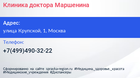 Клиника доктора Маршенина по адресу улица Крупской, 1, Москва в дальнейшем Организация, размещена в следующих категориях: