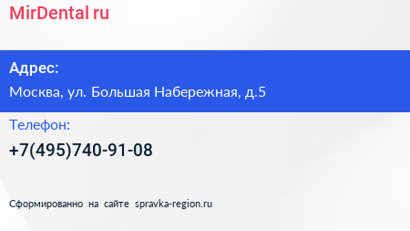 MirDental.ru по адресу Москва, ул. Большая Набережная, д.5 в дальнейшем Организация, размещена в следующих категориях: