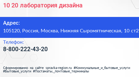 10.20, лаборатория дизайна по адресу 105120, Россия, Москва, Нижняя Сыромятническая, 10 ст2 в дальнейшем Организация, размещена в следующих категориях: