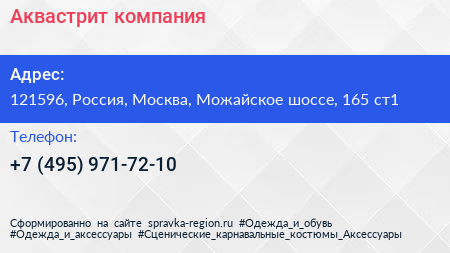 Аквастрит, компания по адресу 121596, Россия, Москва, Можайское шоссе, 165 ст1 в дальнейшем Организация, размещена в следующих категориях:
