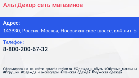 АльтДекор, сеть магазинов по адресу 143930, Россия, Москва, Носовихинское шоссе, вл4 лит Б в дальнейшем Организация, размещена в следующих категориях: