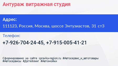 Антураж, витражная студия по адресу 111123, Россия, Москва, шоссе Энтузиастов, 31 ст3 в дальнейшем Организация, размещена в следующих категориях: