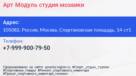 Арт-Модуль, студия мозаики по адресу 105082, Россия, Москва, Спартаковская площадь, 14 ст1 в дальнейшем Организация, размещена в следующих категориях: