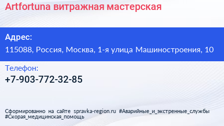 Artfortuna, витражная мастерская по адресу 115088, Россия, Москва, 1-я улица Машиностроения, 10 в дальнейшем Организация, размещена в следующих категориях: