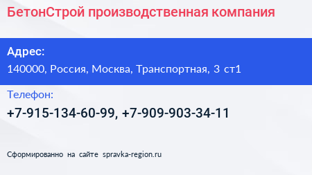 БетонСтрой, производственная компания по адресу 140000, Россия, Москва, Транспортная, 3 ст1 в дальнейшем Организация, размещена в следующих категориях: