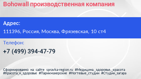 Bohowall, производственная компания по адресу 111396, Россия, Москва, Фрязевская, 10 ст4 в дальнейшем Организация, размещена в следующих категориях:
