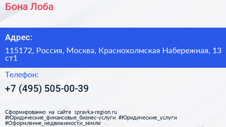 Бона-Лоба по адресу 115172, Россия, Москва, Краснохолмская Набережная, 13 ст1 в дальнейшем Организация, размещена в следующих категориях: