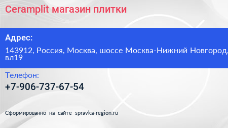 Ceramplit, магазин плитки по адресу 143912, Россия, Москва, шоссе Москва-Нижний Новгород, вл19 в дальнейшем Организация, размещена в следующих категориях: