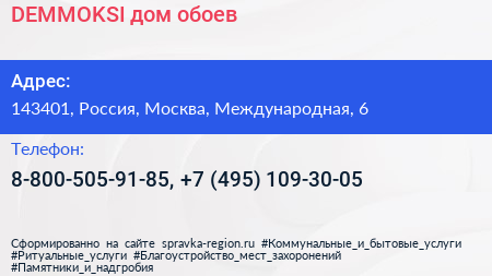 DEMMOKSI, дом обоев по адресу 143401, Россия, Москва, Международная, 6 в дальнейшем Организация, размещена в следующих категориях: