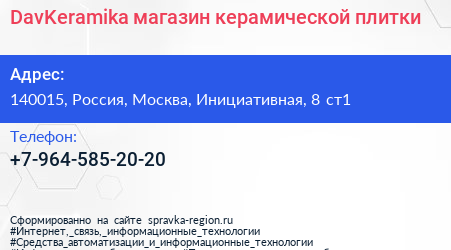 DavKeramika, магазин керамической плитки по адресу 140015, Россия, Москва, Инициативная, 8 ст1 в дальнейшем Организация, размещена в следующих категориях: