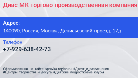 Диас-МК, торгово-производственная компания по адресу 140090, Россия, Москва, Денисьевский проезд, 17д в дальнейшем Организация, размещена в следующих категориях: