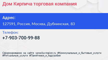 Дом Кирпича, торговая компания по адресу 127591, Россия, Москва, Дубнинская, 83 в дальнейшем Организация, размещена в следующих категориях: