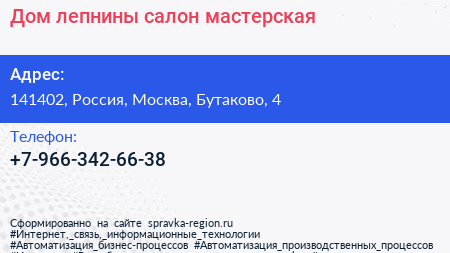 Дом лепнины, салон-мастерская по адресу 141402, Россия, Москва, Бутаково, 4 в дальнейшем Организация, размещена в следующих категориях: