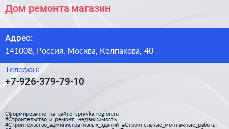 Дом ремонта, магазин по адресу 141008, Россия, Москва, Колпакова, 40 в дальнейшем Организация, размещена в следующих категориях: