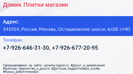 Домик Плитки, магазин по адресу 141014, Россия, Москва, Осташковское шоссе, вл1Б ст40 в дальнейшем Организация, размещена в следующих категориях: