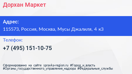 Дорхан Маркет по адресу 115573, Россия, Москва, Мусы Джалиля, 4 к3 в дальнейшем Организация, размещена в следующих категориях: