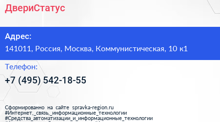 ДвериСтатус по адресу 141011, Россия, Москва, Коммунистическая, 10 к1 в дальнейшем Организация, размещена в следующих категориях: