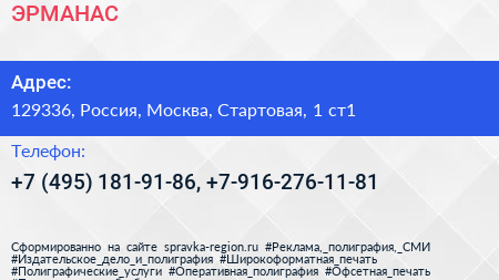 ЭРМАНАС по адресу 129336, Россия, Москва, Стартовая, 1 ст1 в дальнейшем Организация, размещена в следующих категориях: