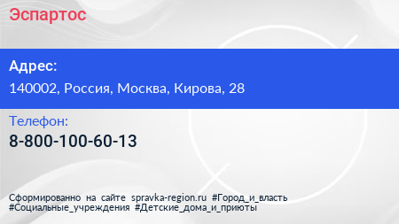 Эспартос по адресу 140002, Россия, Москва, Кирова, 28 в дальнейшем Организация, размещена в следующих категориях: