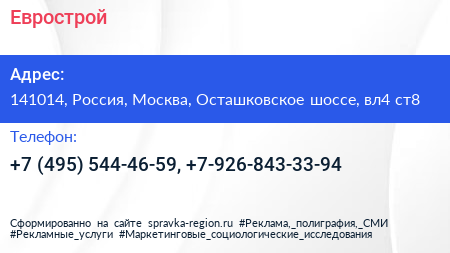 Еврострой по адресу 141014, Россия, Москва, Осташковское шоссе, вл4 ст8 в дальнейшем Организация, размещена в следующих категориях: