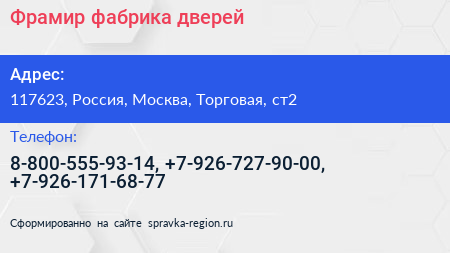 Фрамир, фабрика дверей по адресу 117623, Россия, Москва, Торговая, ст2 в дальнейшем Организация, размещена в следующих категориях: