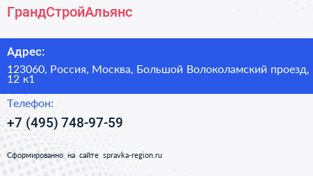ГрандСтройАльянс по адресу 123060, Россия, Москва, Большой Волоколамский проезд, 12 к1 в дальнейшем Организация, размещена в следующих категориях: