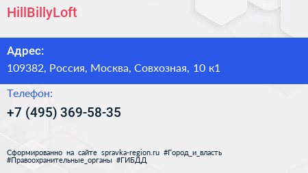 HillBillyLoft по адресу 109382, Россия, Москва, Совхозная, 10 к1 в дальнейшем Организация, размещена в следующих категориях: