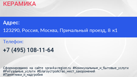 КЕРАМИКА по адресу 123290, Россия, Москва, Причальный проезд, 8 к1 в дальнейшем Организация, размещена в следующих категориях: