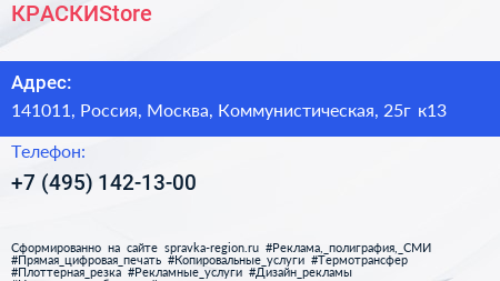 КРАСКИStore по адресу 141011, Россия, Москва, Коммунистическая, 25г к13 в дальнейшем Организация, размещена в следующих категориях: